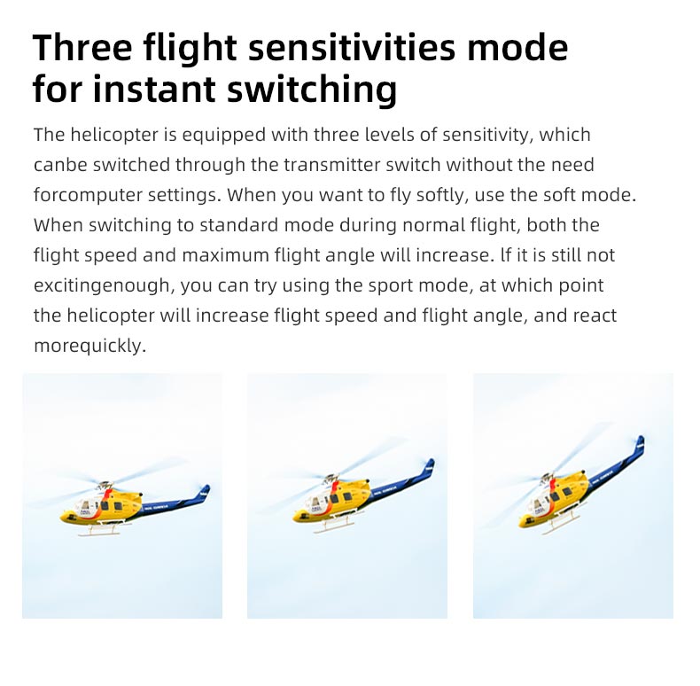 The Fly Wing Bell-412 RC Helicopter offers multiple flight modes, including GPS Mode, 3D Manual Mode, and Assisted Flight, allowing pilots to choose the mode that best suits their skill level and flying conditions.