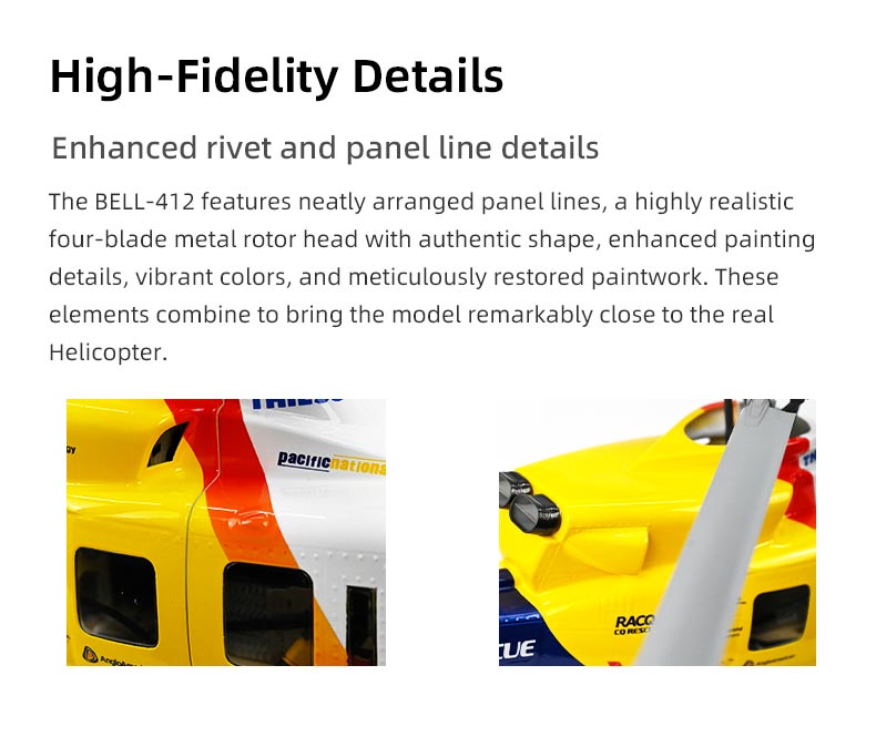 Maintenance is straightforward. Regularly inspect the propellers, motors, and batteries, tighten any loose screws, and clean the airframe after each flight. Keeping the Fly Wing Bell-412 RC Helicopter in good condition ensures consistent performance and longer lifespan.