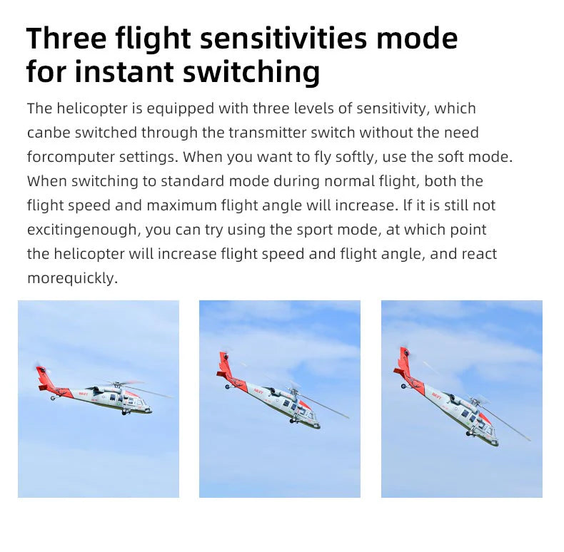 The helicopter is equipped with three levels of sensitivity, which canbe switched through the transmitter switch without the need forcomputer settings. When you want to fly softly, use the soft mode. When switching to standard mode during normal flight, both the flight speed and maximum flight angle will increase. If it is still not excitingenough, you can try using the sport mode, at which point the helicopter will increase flight speed and flight angle, and react morequickly.