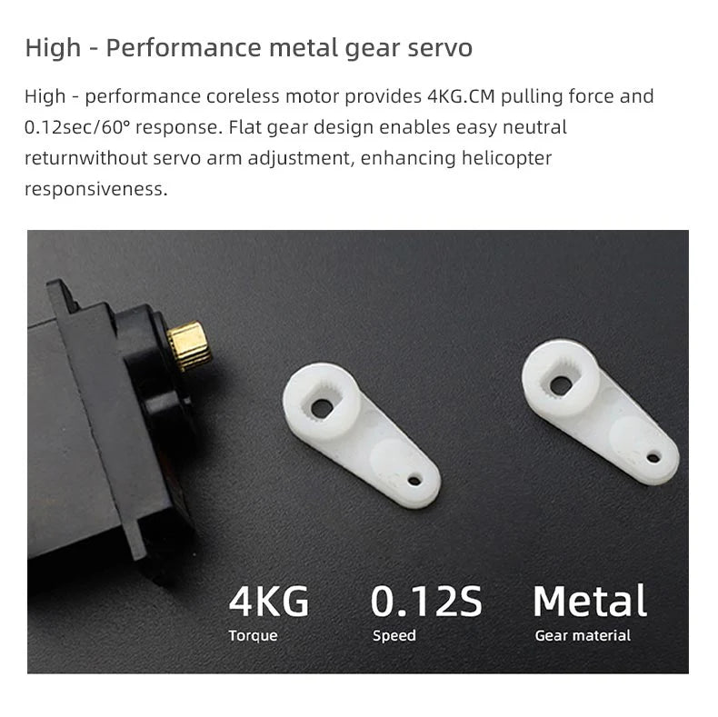 High - performance coreless motor provides 4KG.CM pulling force and 0.12sec/60° response. Flat gear design enables easy neutral returnwithout servo arm adjustment, enhancing helicopter responsiveness.