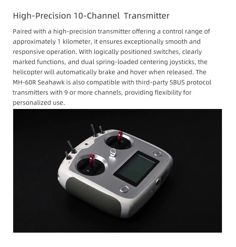 Paired with a high-precision transmitter offering a control range of approximately 1 kilometer, it ensures exceptionally smooth and responsive operation. With logically positioned switches, clearly marked functions, and dual spring-loaded centering joysticks, the helicopter will automatically brake and hover when released. The MH-60R Seahawk is also compatible with third-party SBUS protocol transmitters with 9 or more channels, providing flexibility for personalized use.