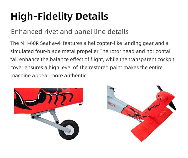 The MH-60R Seahawk features a helicopter-like landing gear and a simulated four-blade metal propeller The rotor head and horizontal tail enhance the balance effect of flight, while the transparent cockpit cover ensures a high level of The restored paint makes the entire machine appear more authentic.