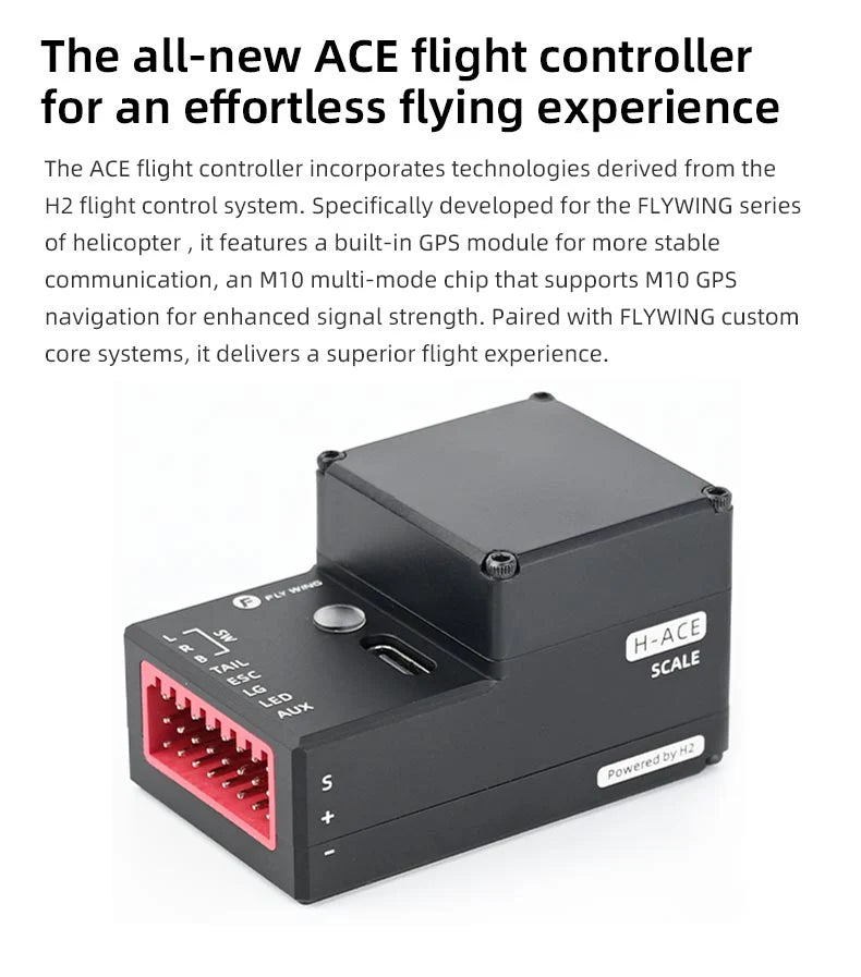 The ACE flight controller incorporates technologies derived from the H2 flight control system. Specifically developed for the FLYWING series of helicopter , it features a built-in GPS module for more stable communication, an M10 multi-mode chip that supports M10 GPS navigation for enhanced signal strength. Paired with FLYWING custom core systems, it delivers a superior flight experience.